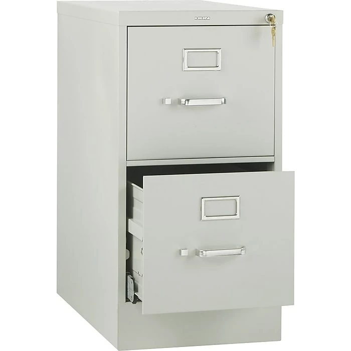 HON 510 Series 2-Drawer vertical file cabinet in light gray finish measures 29.0″ x 15.0″ x 25.0″ and has double-walled front kickplate to resist impact. Letter size cabinet with 4 vertical reinforcements is ideal for high-security document storage.