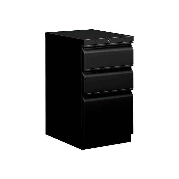 Organize a work space with this office mobile-pedestal cabinet. Three box drawers with ball bearing suspension provide easy-access storage for office supplies, and the file drawer at the bottom allows for organization of documents and hanging file folders. Place this 15-inch HON Brigade cabinet under your desk, move it easily with its swivel back casters and lock it before leaving your desk.