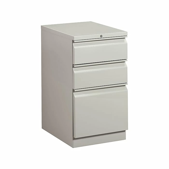 Organize a work space with this file cabinet. Three box drawers with ball bearing suspension provide easy-access storage for office supplies, and the file drawer at the bottom allows for organization of documents and hanging file folders. Measuring 28 inches tall, this HON Brigade vertical cabinet can fit under your desk to save space, or you can set it nearby for additional counter space.