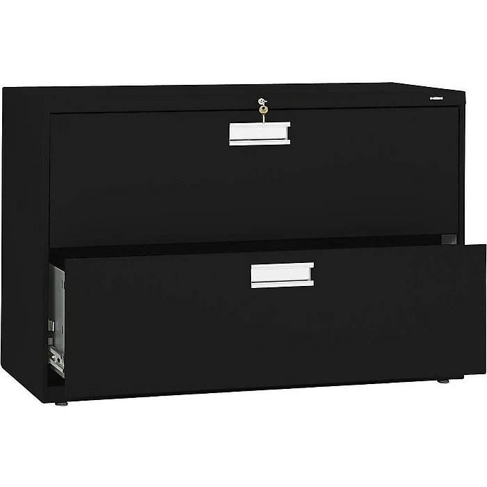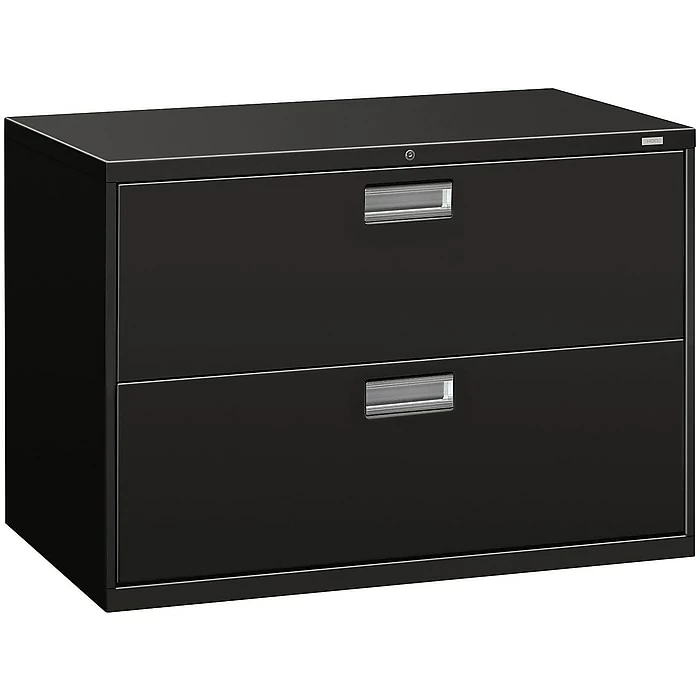 Keep paperwork organized with this HON 600 series two-drawer lateral file cabinet. Its durable steel frame can stand up to everyday use, and the two drawers operate smoothly and quietly thanks to ball bearing suspensions, while a mechanical interlock prevents multiple drawers from opening at the same time. With a two-sided lock mechanism and removable lock core, this HON Brigade 600 series lateral file keeps sensitive documents securely tucked away.