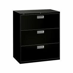 - Three-drawer lateral filing cabinet holds letter- or legal-size documents