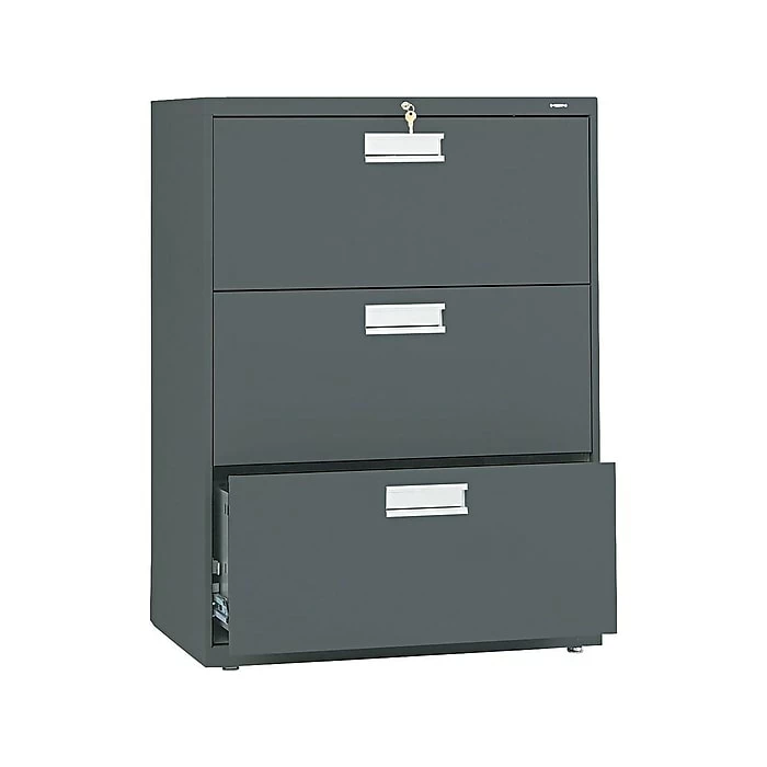 - Three-drawer lateral filing cabinet holds letter- or legal-size documents