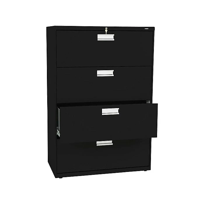- Four-drawer lateral filing cabinet holds letter- or legal-size documents