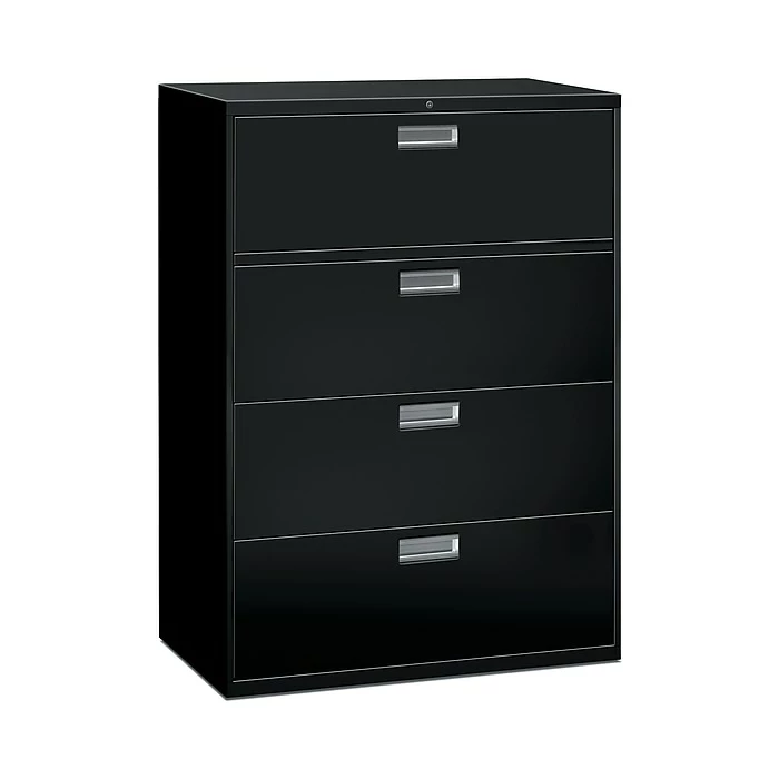 - Four-drawer lateral filing cabinet holds letter- or legal-size documents