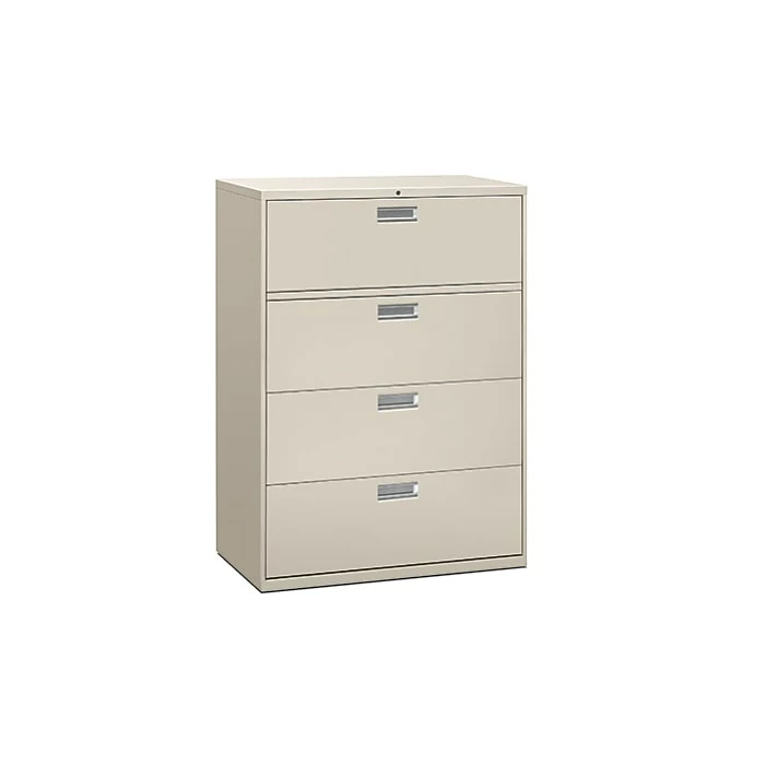- Four-drawer lateral filing cabinet holds letter- or legal-size documents
