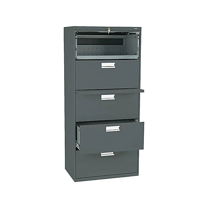 Add fashionable function to your office space with this charcoal-finished lateral file cabinet. The five spacious drawers accept legal and letter-size files for versatility, and the space-saving design fits well in most office floor plans. Designed for high-activity filing, it boasts all-welded metal construction and an interlock mechanism that ensures durability and prevents tipping. Lock down important documents worry-free thanks to the interchangeable-core lock and two-sided tamper-resistant locking mechanism on this HON 600 filing cabinet.