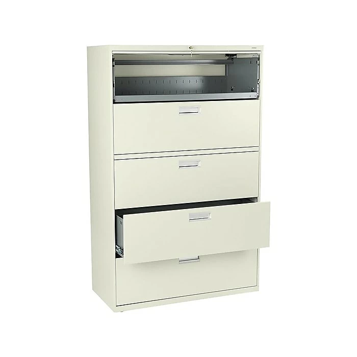 Organize important files and documents with this five-drawer lateral file cabinet. The integrated two-sided locking mechanism prevents unauthorized entry, and the built-in counterweight prevents the cabinet from tipping forward when the drawers are fully extended. This HON Brigade 600 lateral file has heavy-duty steel ball bearings that makes the drawers easy to open and close, and the all-welded case helps the cabinet stand up to commercial environments.