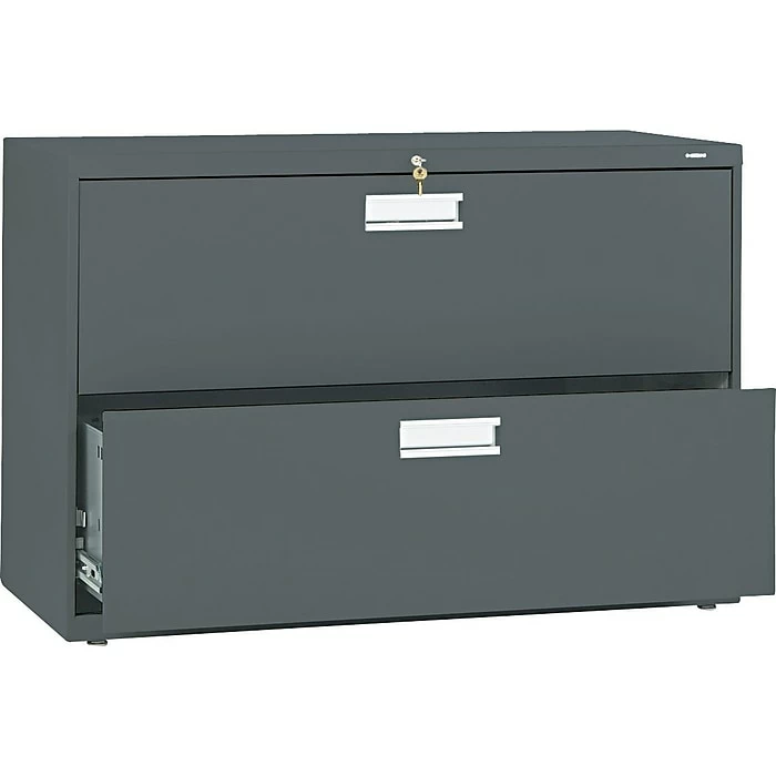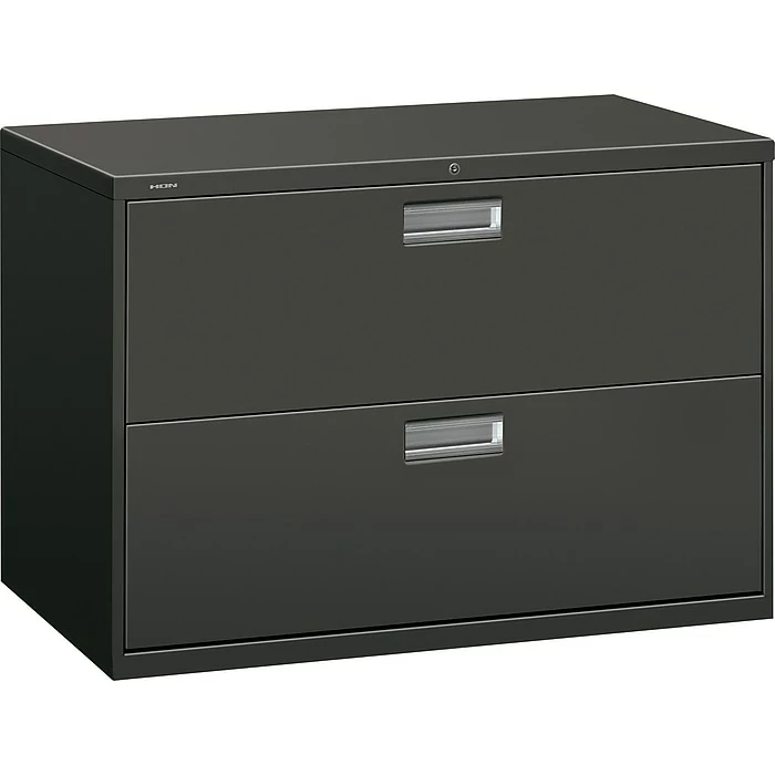 HON® Brigade™ 600 Series Lateral file cabinet in charcoal color is constructed from 30 percent post consumer materials. Lateral file cabinet measuring 28 3/8″ x 42″ x 19 1/4″ features two drawers for storing the files up to 3.5 cu. ft.