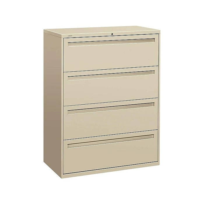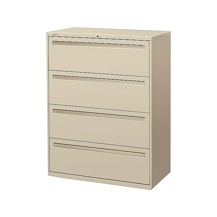 File away important documents in your home or office with this large putty-colored filing cabinet. The four drawers offer plenty of storage capacity for letter- or legal-size files, and the full-width recessed handles provide a reliable grip. This 42-inch wide HON lateral file has interlocked drawers and a built-in counterweight to ensure stability.