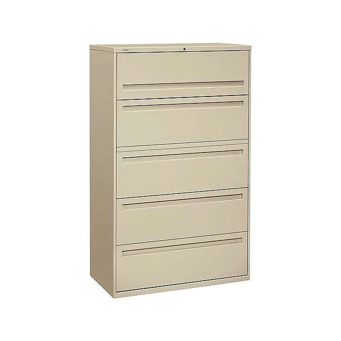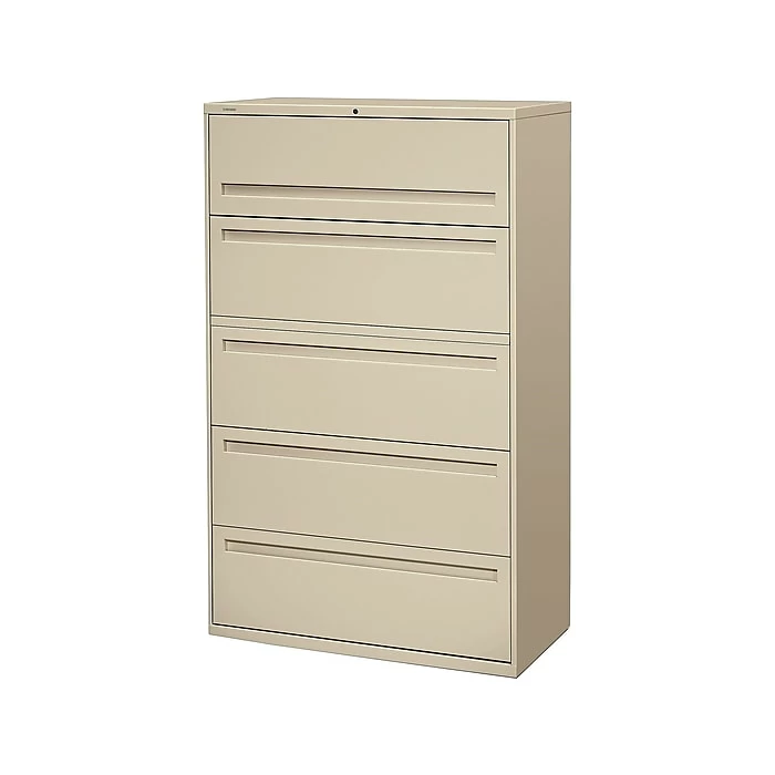 - Five-drawer lateral filing cabinet holds letter- or legal-size documents