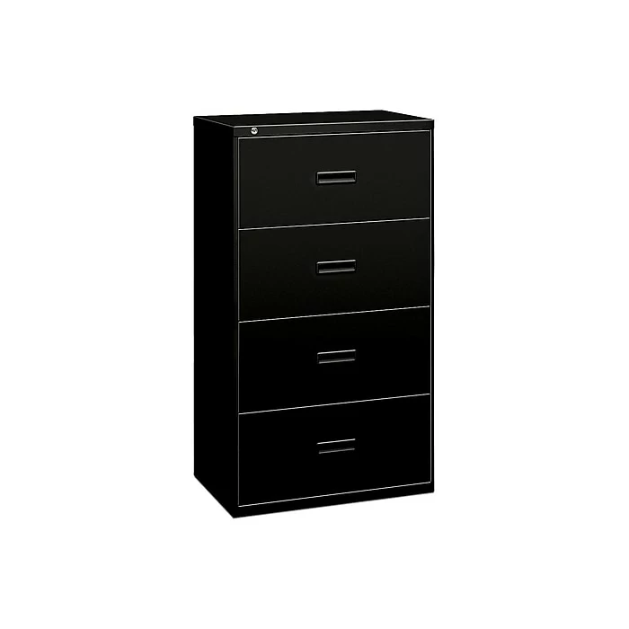 This four-drawer, 36″W model has a tamper-resistant enclosed base. Cabinet accepts letter or legal hanging file folders. Molded polymer handle is standard. Finish color is Black.