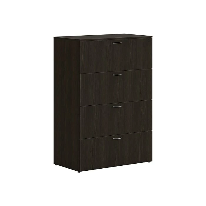 - Four-drawer lateral file cabinet holds letter- or legal-size documents
