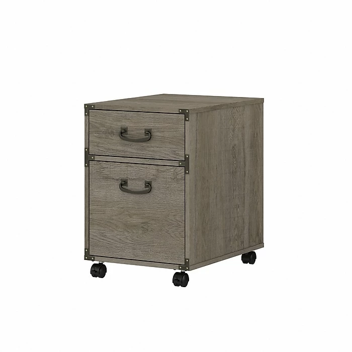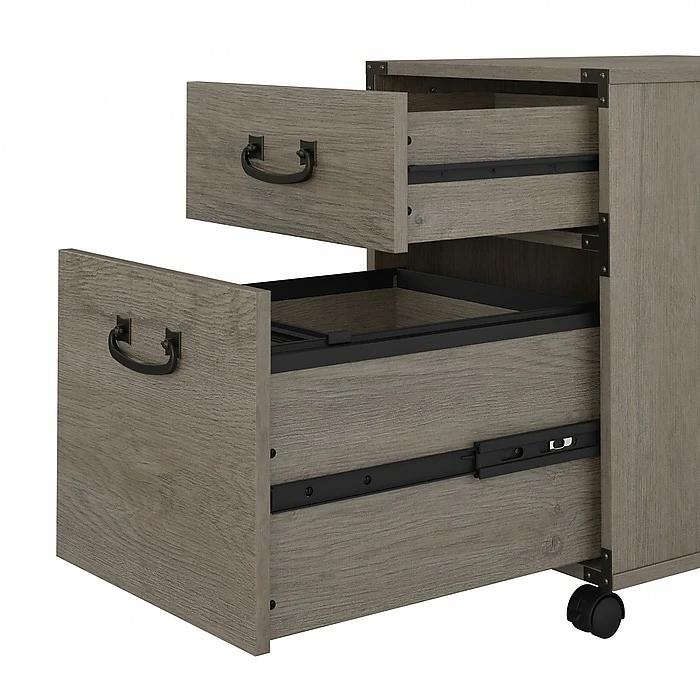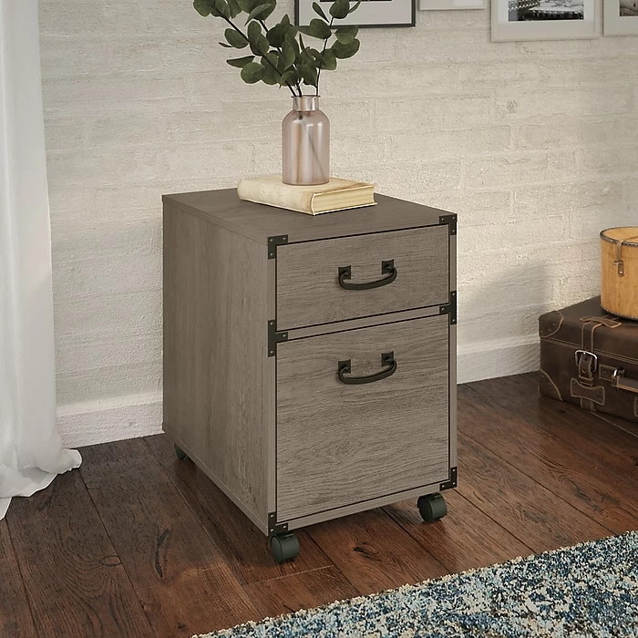 The kathy ireland Home by Bush Furniture Ironworks two-drawer mobile file cabinet presents a home office storage solution that celebrates the unique style of the vintage industrial design. One file drawer and one box drawer make it easy to organize your letter-, legal, and A4-size paperwork as well as small office supplies. The file drawer stores up to 30 lbs. worth of documents and opens on smooth, full-extension ball bearing slides for easy reach to contents. Dual-wheeled casters move the portable file cabinet wherever storage is needed and can be locked in place once you’ve found the perfect position. The two-drawer file cabinet fits under coordinating kathy ireland Home by Bush Furniture Ironworks writing desks (sold separately) for convenient access to materials. This rolling file cabinet has been tested to meet ANSI/SOHO standards for safety and performance and is backed by a 3-year manufacturer limited warranty.