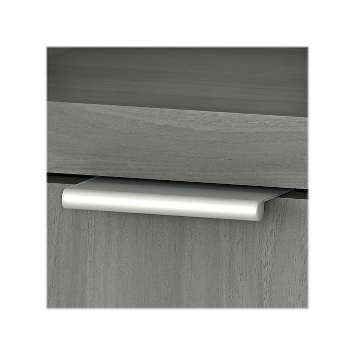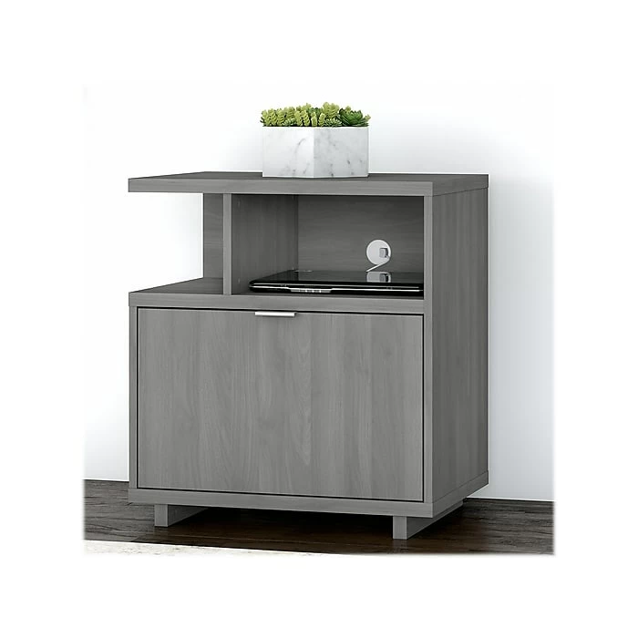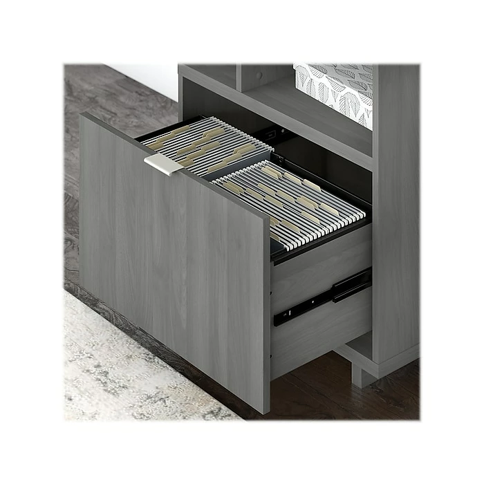 The stylish and progressive kathy ireland® Home by Bush Furniture Madison Avenue lateral file cabinet with shelves presents a storage solution with a modern flair. A perfect choice for home offices, the single-drawer filing cabinet opens on smooth, full-extension ball-bearing slides for an effortless reach to legal-, letter-, and A4-size paperwork. Two open shelves provide a convenient place for books and decorations, and the back panel includes a built-in wire management grommet to accommodate electronics. The surface can also be used to brighten up the room with your favorite pictures and décor. Find the perfect style to complement your work or living space with three attractive finish options.