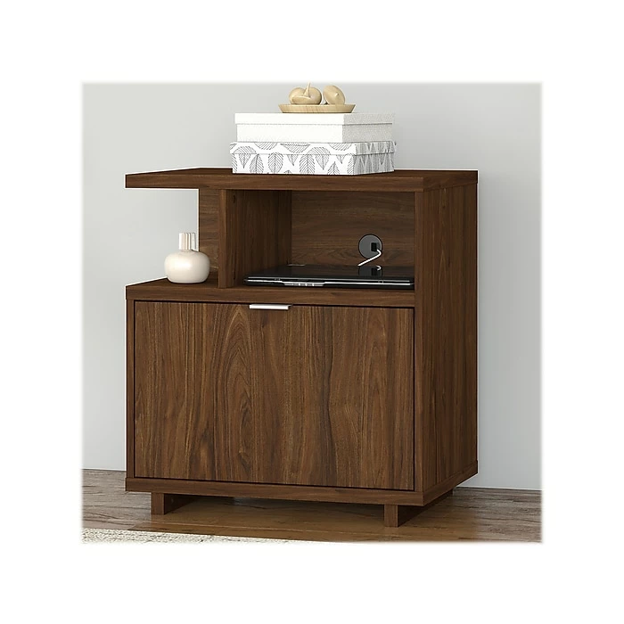 The stylish and progressive kathy ireland® Home by Bush Furniture Madison Avenue lateral file cabinet with shelves presents a storage solution with a modern flair. A perfect choice for home offices, the single-drawer filing cabinet opens on smooth, full-extension ball-bearing slides for an effortless reach to legal-, letter-, and A4-size paperwork. Two open shelves provide a convenient place for books and decorations, and the back panel includes a built-in wire management grommet to accommodate electronics. The surface can also be used to brighten up the room with your favorite pictures and décor. Find the perfect style to complement your work or living space with three attractive finish options.