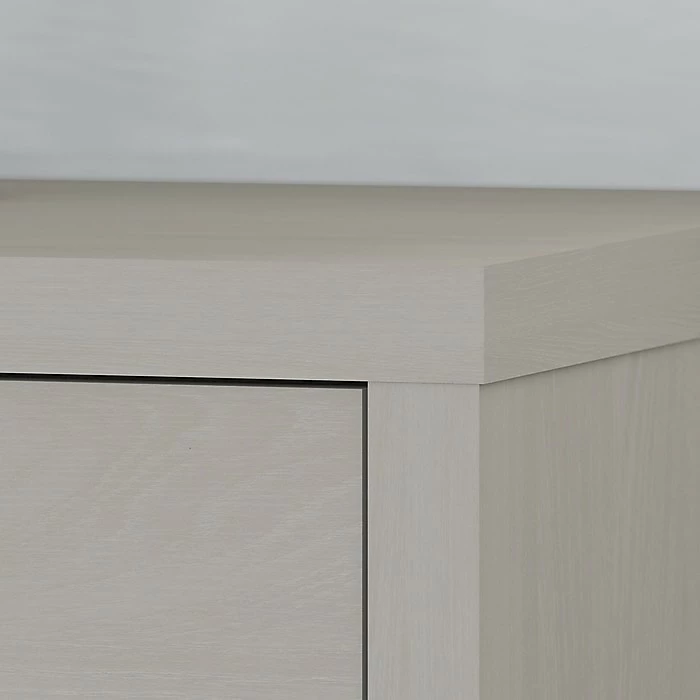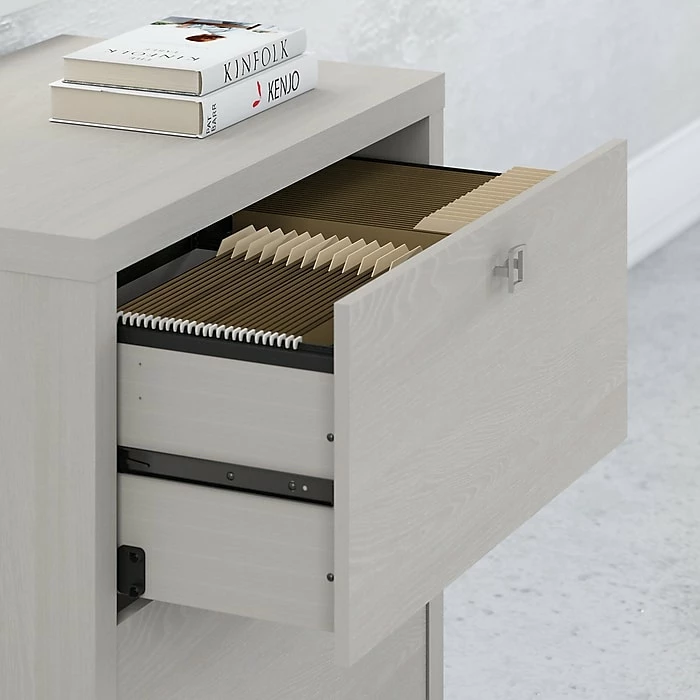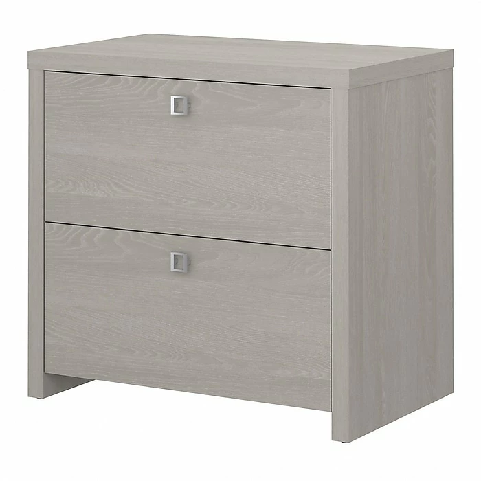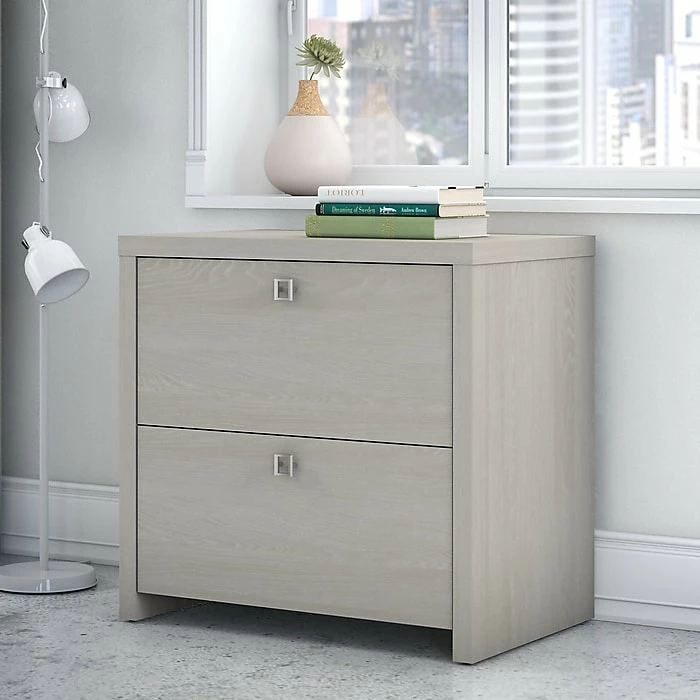 The Office by kathy ireland® Echo lateral file cabinet organizes the home or professional space while expressing your uniquely fashionable tastes. Feel inspired by the beautiful blend of an attractive finish and stylish satin silver hardware. Designed to make organization easy, the contemporary lateral file cabinet contains two spacious drawers that open on full-extension ball bearing slides for an effortless reach to letter- and legal-size documents. The file cabinet provides an impressively thick, durable surface to create a strong design with a thermally fused laminate finish that resists scratches and stains. From Office by kathy ireland®, the two-drawer lateral file cabinet comes with a 3-year manufacturer warranty and meets ANSI/BIFMA quality standards for safety and performance. Celebrate your unique style and personality with the Echo collection.