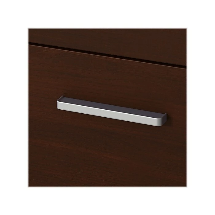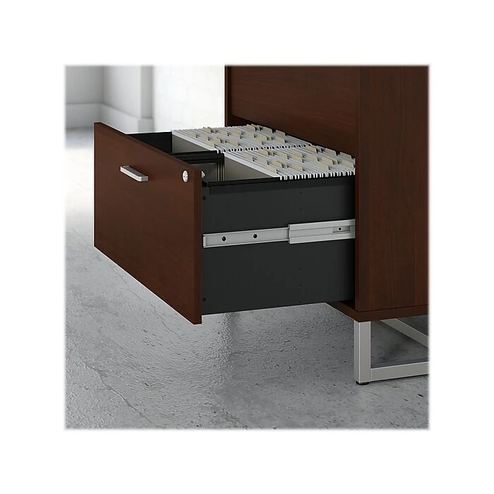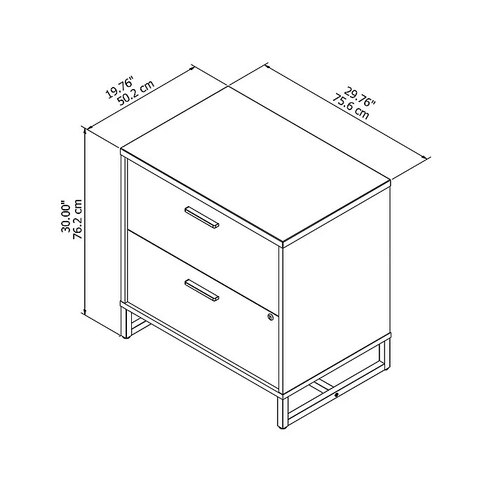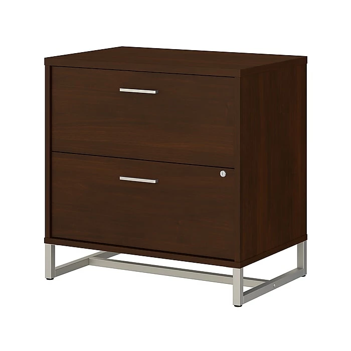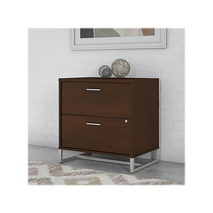 The Office by kathy ireland Method two-drawer lateral file cabinet has an urban appeal perfect for a small business or home office. Embrace the unique styling of mid-century modern design and enjoy ample storage with the Office by kathy ireland Method lateral file cabinet. The two-drawer cabinet offers a beautiful and durable metal base along with titanium finished hardware. Constructed of 100% thermally fused laminate, the filing cabinet fends off scratches and stains to maintain the attractive design. Organize your most important paperwork in the full-extension file drawers, which open effortlessly on smooth ball-bearing slides. A single lock secures both drawers for your privacy, and the lateral file cabinet matches the height of your desk for an expanded work surface. For your convenience, the cabinet ships fully assembled. From Office by kathy ireland and Bush Business Furniture, the Method collection comes with a 6-year warranty and meets ANSI/BIFMA standards. American made with U.S. and imported parts.
