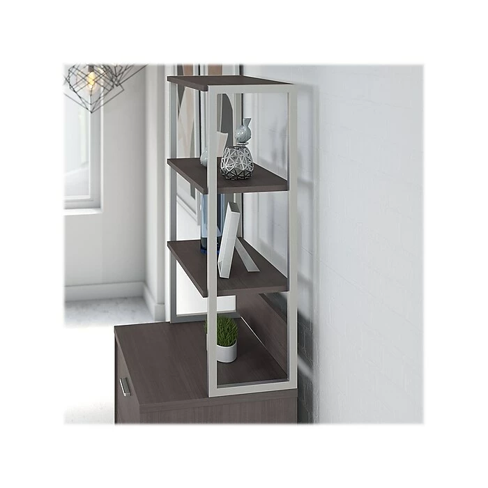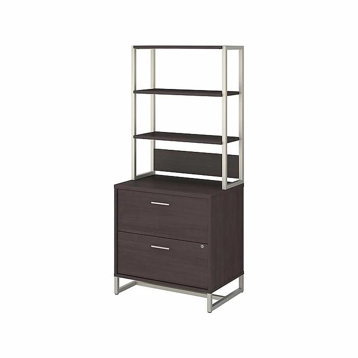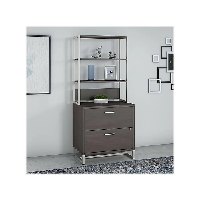 Stylish yet functional, the Office by kathy ireland Method lateral file cabinet with hutch offers a unique blend of metal and wood. Embrace the unique styling of mid-century modern design and enjoy ample storage with the Office by kathy ireland Method lateral file cabinet with hutch. The two-drawer cabinet offers a beautiful and durable metal base along with titanium-finished hardware. Constructed of 100% thermally fused laminate, the filing cabinet fends off scratches and stains to maintain the attractive design. Organize your most important paperwork in the full-extension file drawers which open effortlessly on smooth ball-bearing slides. A single lock secures both drawers for your privacy. With durable shelves and a metal frame, the hutch mounts to the lateral file cabinet and offers open display space for books, photos and more. From Office by kathy ireland and, the Method collection comes with a 6-year warranty and meets ANSI/BIFMA standards. American-made with U.S. and imported parts.