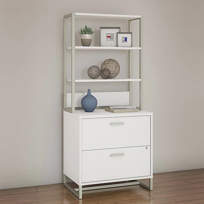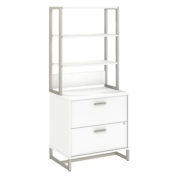 Embrace the unique styling of mid century modern design and enjoy ample storage with the Office by kathy ireland® Method Lateral File Cabinet with Hutch. The 2 drawer cabinet offers a beautiful and durable metal base along with titanium finished hardware. Constructed of 100% thermally fused laminate, the filing cabinet fends off scratches and stains to maintain the attractive design. Organize your most important paperwork in the full-extension file drawers, which open effortlessly on smooth ball-bearing slides. A single lock secures both drawers for your privacy. With durable shelves and a metal frame, the Hutch mounts to the Lateral File Cabinet and offers open display space for books, photos and more. From Office by kathy ireland® and Bush Business Furniture, the Method collection comes with a 6 Year Warranty and meets ANSI/BIFMA standards. American made with U.S. and imported parts.