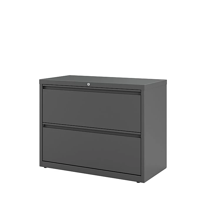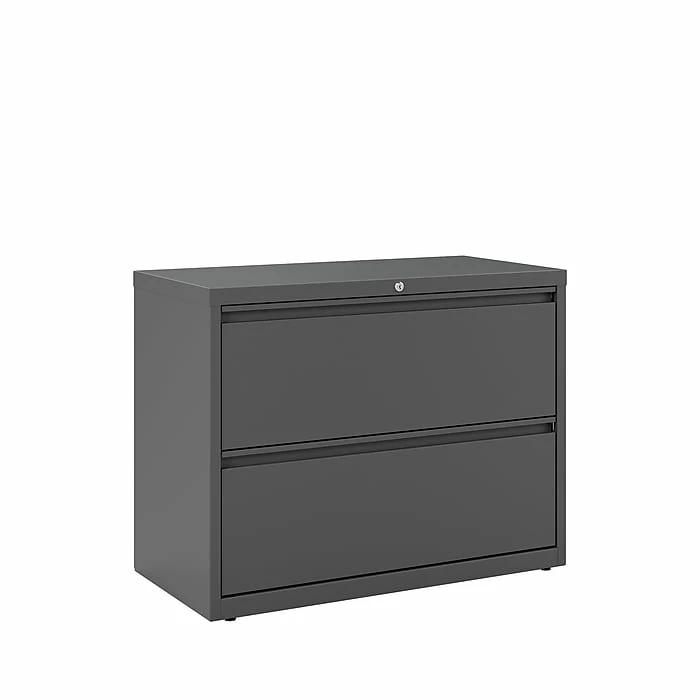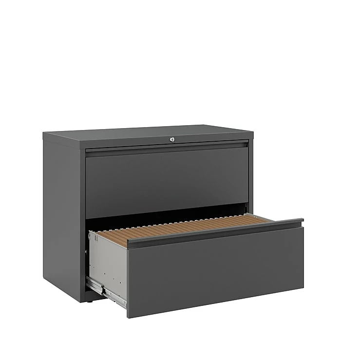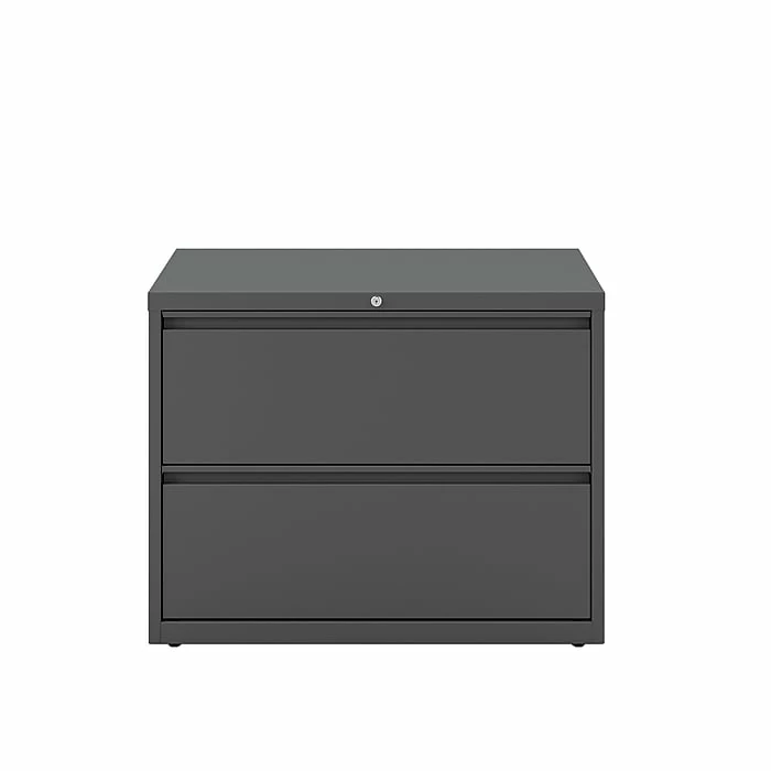 Keep important paperwork neatly organized with this letter/legal lateral file cabinet. Two spacious drawers keep file folders neatly aligned, and the ball-bearing slide suspension makes each drawer easy to open and close. Use the adjustable hang rails for flexible filing options. This letter/legal lateral file cabinet features recessed handles and a neutral black color for a streamlined appearance.
