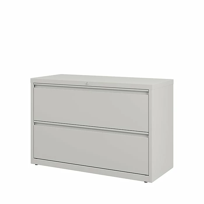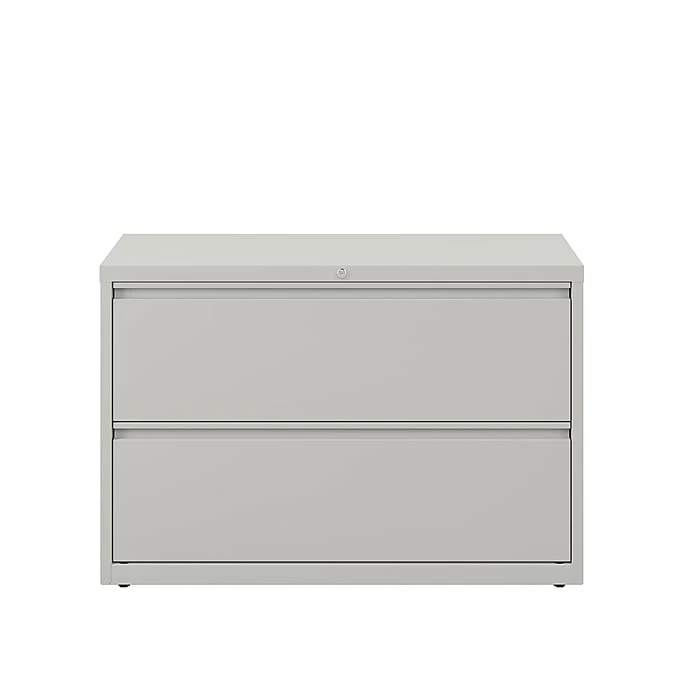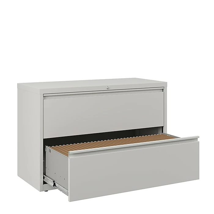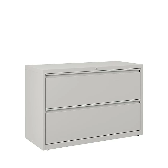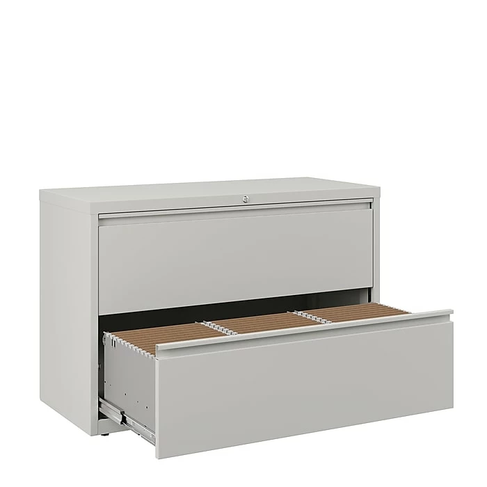 Bring durable document storage to your professional workspace with this lateral file cabinet. Two wide drawers offer ample room for hanging file folders, and the precision ball-bearing slides help each drawer open smoothly. The adjustable leveling guides keep this cabinet stable on carpeted or hard flooring surfaces. Featuring mechanical interlock and drawer extension restraints, this commercial file cabinet resists tipping for added safety. A core removable lock keeps sensitive information safely stored inside this two-drawer filing cabinet.