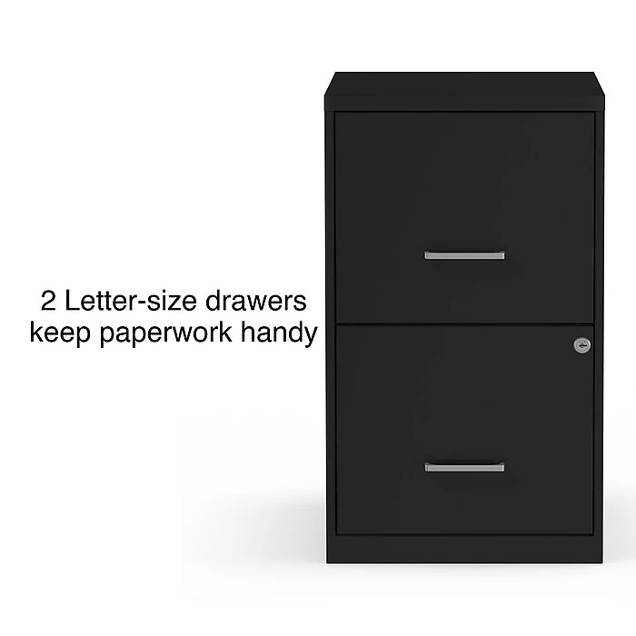 File forms, applications, reports and other documents with this vertical file cabinet. A single lock keeps both drawers secure, preventing unauthorized access to sensitive documents. The two spacious file drawers offer ample storage space for important papers, and the unique design accommodates letter-size hanging folders for versatile storage options. This black letter-size file cabinet features a compact size, making it a smart option for use in cubicles, home offices or other smaller work areas.