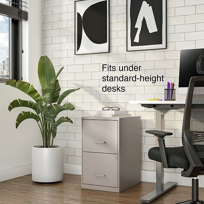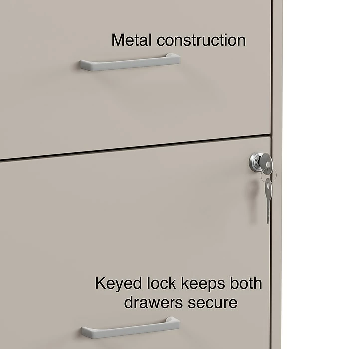 Store documents in this light duty vertical file cabinet. The two drawers accept letter-size hanging file folders for versatile filing options, while the keyed lock keeps items securely stashed inside. Durable metal construction makes this cabinet ideal for occasional use everyday in an office, cubicle or other professional setting. A soft putty color and silver-tone hardware offer a classic look that blends with a range of office decor themes. With its compact size, this letter-size file cabinet fits neatly next to a desk or in a small workspace.