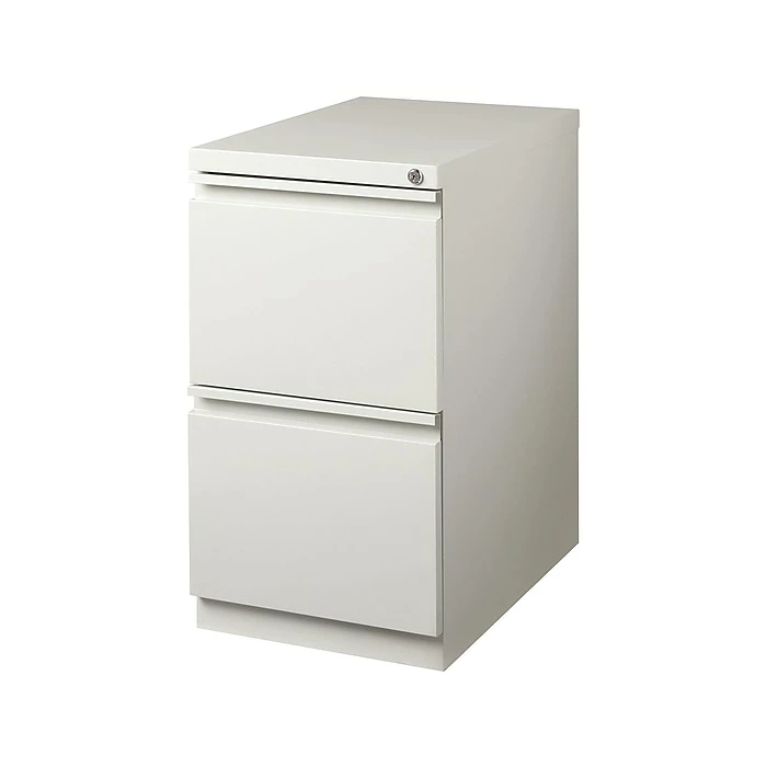 Keep your office organized and store important records with this two-drawer pedestal file cabinet. Boasting a compact design, this cabinet easily fits under desks and has concealed casters for easy portability. Two deep drawers provide ample space for file storage and offer easy access to important documents with three-piece ball-bearing suspensions, while a built-in lock keeps stored materials secure. This two-drawer pedestal file cabinet enhances office decor with its light gray finish and sleek appearance.