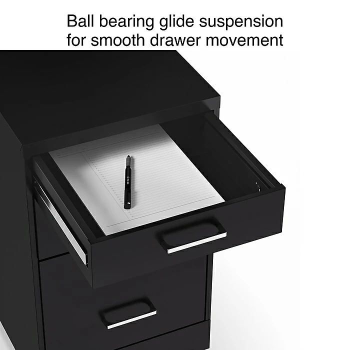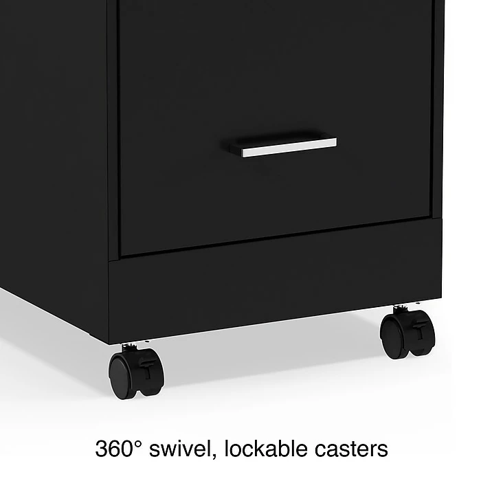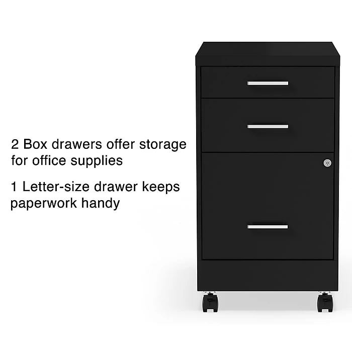 Expand your available storage options with this mobile file cabinet. Two box drawers offer space for office supplies, personal belongings and other small items, while the letter-size file drawer keeps paperwork close at hand. A keyed lock system prevents unauthorized access, keeping contents stored securely inside. This cabinet features rolling casters, so you can move your documents virtually anywhere in your workspace. With its compact size, this three-drawer vertical file cabinet fits neatly under a desk or in smaller spaces.