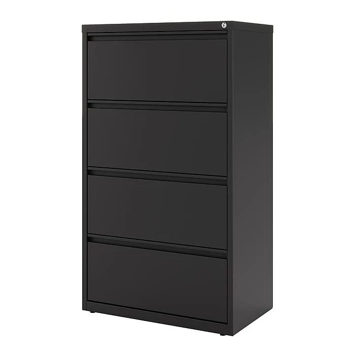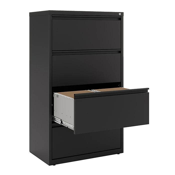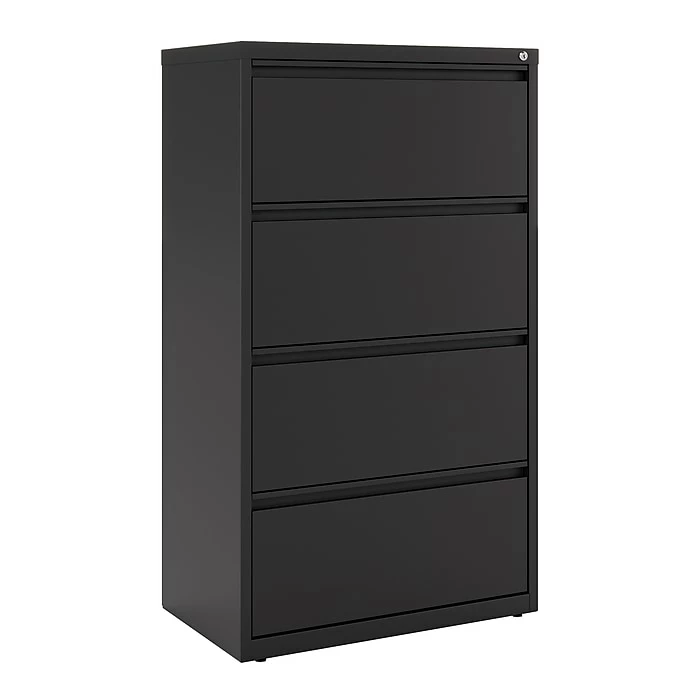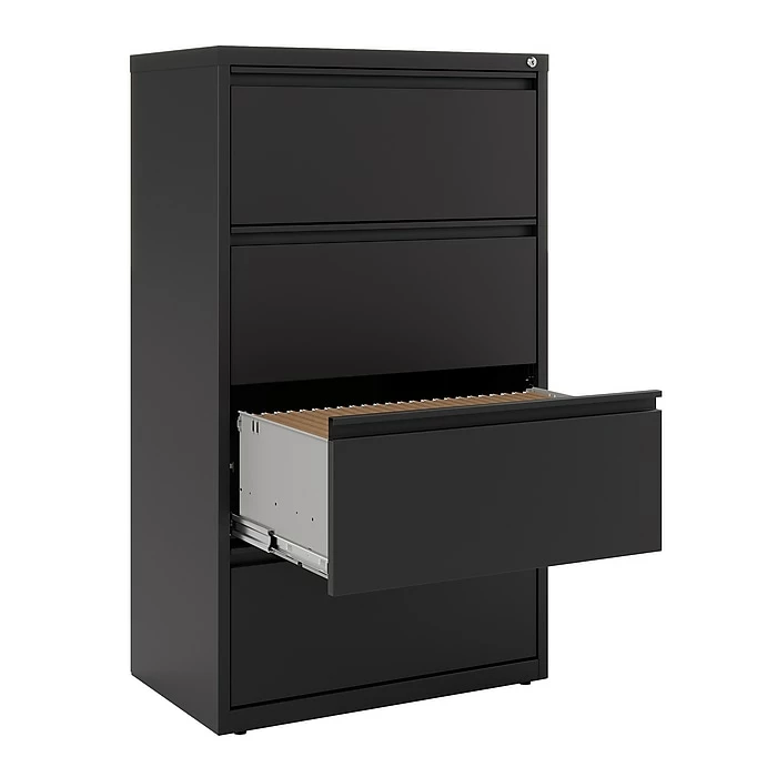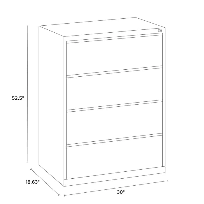 - Four-drawer lateral filing cabinet holds letter or legal size documents