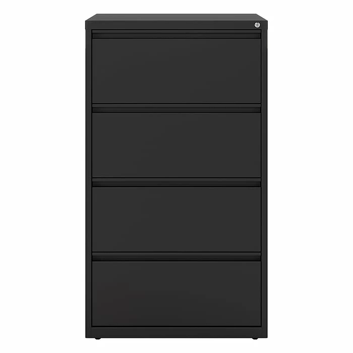 Expand your filing capabilities with this lateral file cabinet. The four wide drawers accept letter and legal hanging file folders for flexible document storage options, and the precision ball-bearing glides help each drawer open smoothly. Adjustable leveling glides keep this cabinet even on carpeted or hard flooring surfaces. Use the factory-installed lock to secure contents stored inside and prevent unauthorized access to sensitive files. With metal construction and a baked-enamel finish, this four-drawer commercial filing cabinet stands up to heavy, everyday use.