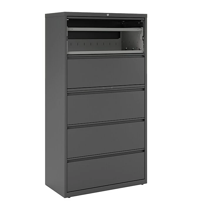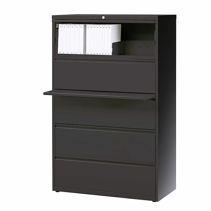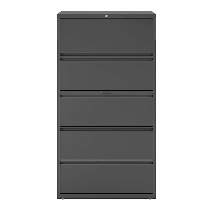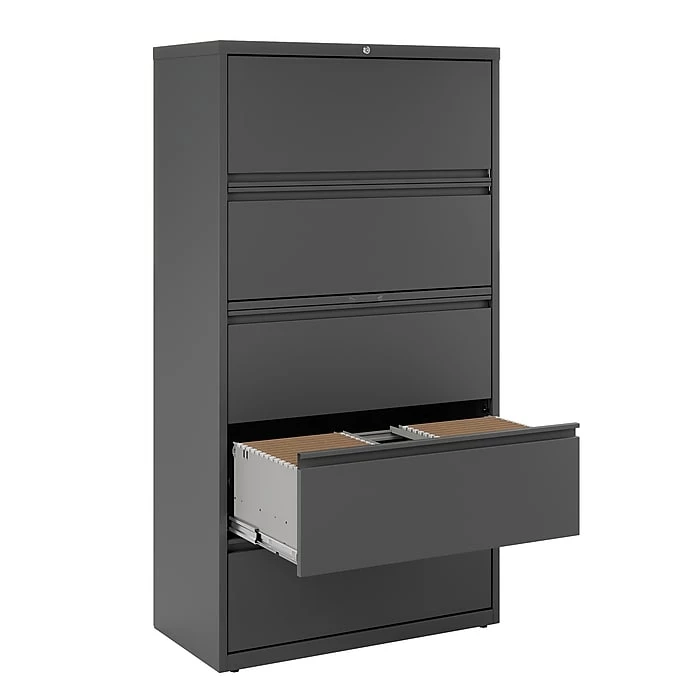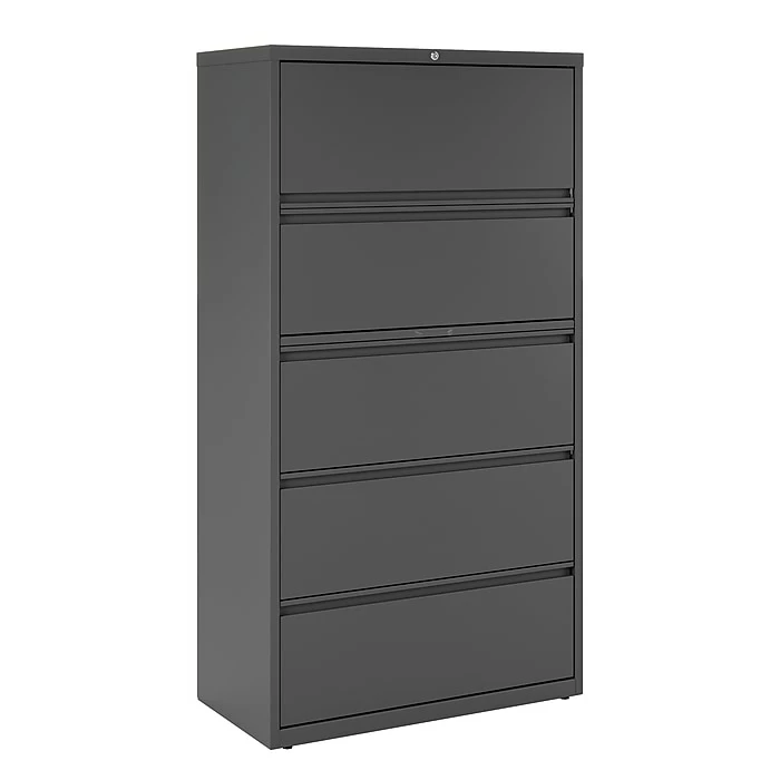 Make your office more organized and keep track of important records with this five-drawer lateral file cabinet. Featuring five 36-inch-wide drawers, this cabinet accommodates large numbers of letter, legal and A4-sized folders and lets you file documents side-by-side with its adjustable hangrails. Full-width drawer pulls offer easy access to stored documents, while the three-piece ball-bearing suspensions and adjustable leveling guides ensure the drawers open and close smoothly. This charcoal lateral file cabinet keeps stored materials secure with a built-in lock.