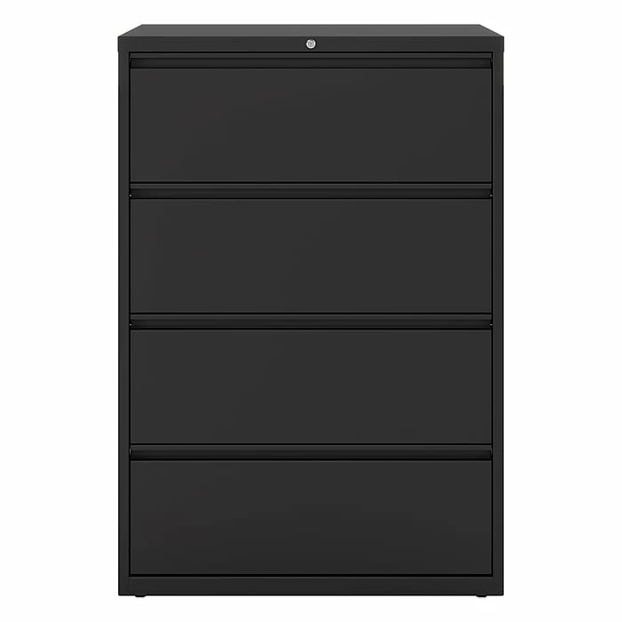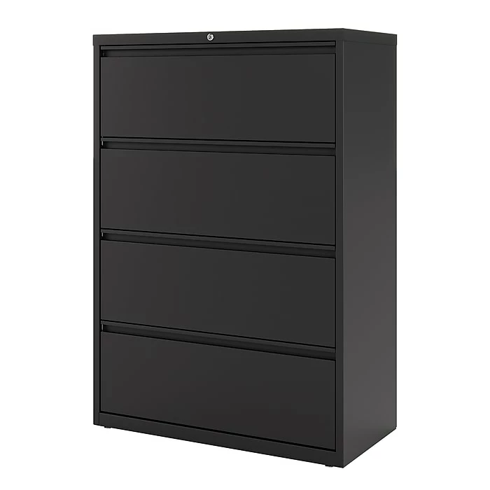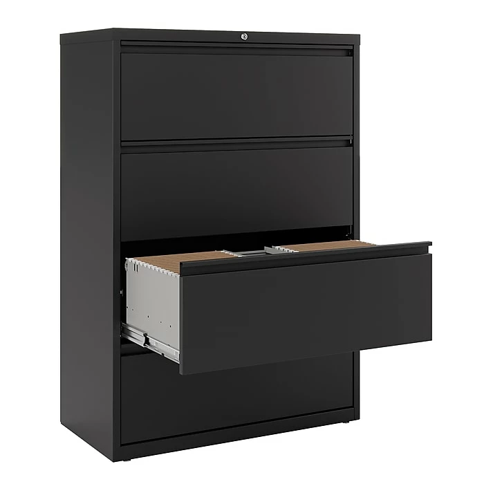 Get a durable, large-capacity solution for business record-keeping with this four-drawer lateral file cabinet. Boasting a small footprint, this cabinet fits easily in most workplaces and provides ample space for storing letter, legal and A4-size documents with four 36-inch-wide drawers. Wide drawer pulls and three-piece ball-bearing suspensions offer easy access to stored materials, while a built-in lock makes it easy to secure sensitive documents. This lateral file cabinet lets you file documents side-by-side with its adjustable hangrails.