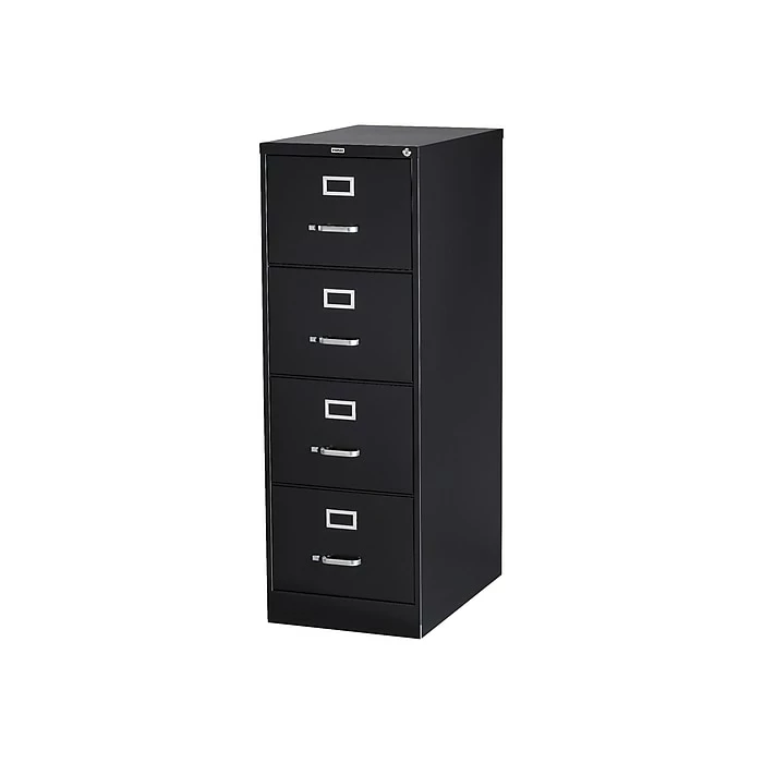 Keep forms, reports and other paperwork stored inside this legal-size vertical file cabinet. Each of the four spacious drawers boasts precision ball-bearing glides for easy opening and closing, while the silver-tone frames offer space for adding subject labels. With its upright design, this cabinet takes up minimal floor space, and adjustable wire followers accept hanging folders to keep files neatly aligned. This four-drawer file cabinet features a core removable lock system to keep sensitive documents secure.