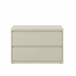 - Four-drawer lateral filing cabinet holds letter or legal size documents