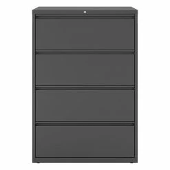 Organize your workplace and keep up with recordkeeping by using this commercial four-drawer lateral file cabinet. Featuring four large-capacity drawers, this cabinet provides ample space for storing letter and legal-size files and offers easy access to stored materials with wide drawer pulls and precision ball-bearing slide suspensions. A built-in lock makes it easy to secure the drawers, ideal for managing access to sensitive documents. This black lateral file cabinet enhances office decor with its black enamel finish and sleek form factor.
