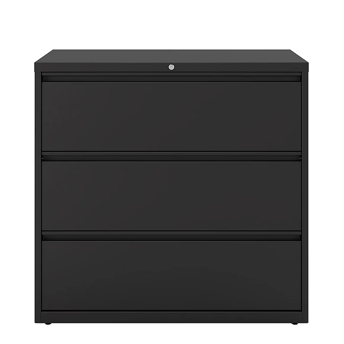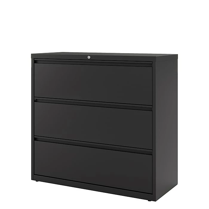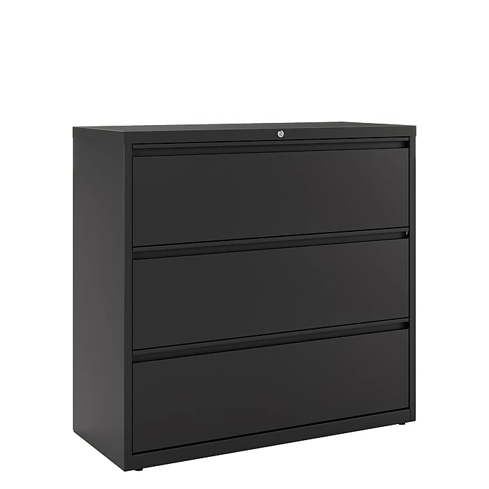 Keep your workplace organized and securely store important documents with this commercial three-drawer lateral file cabinet. Ideal for record-keeping, the three 42-inch-wide drawers accommodate large numbers of letter, legal and A4-size files, while the built-in lock lets you manage access to sensitive materials. Boasting a rugged steel construction, this cabinet offers impressive durability and maintains a professional appearance with a scratch-resistant enamel finish. This three-drawer lateral file cabinet offers easy access to stored materials with wide drawer pulls and precision ball-bearing suspensions.