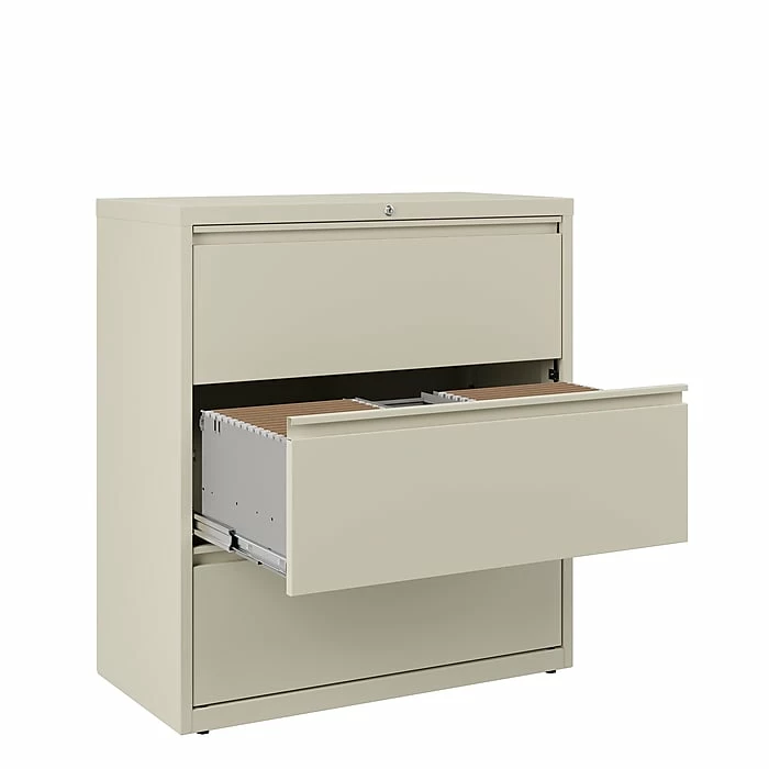 Enhance office organization and keep track of important records with this three-drawer lateral file cabinet. Ideal for recordkeeping, the three 36-inch-wide drawers accommodate large numbers of letter and legal-sized documents and offer consistently smooth operation with three-piece ball-bearing slide suspensions and wide drawer pulls. The rugged steel construction and scratch-resistant enamel finish let this cabinet stand up to intense use, perfect for busy offices. This putty commercial lateral file cabinet lets you manage access to stored materials with a built-in lock.