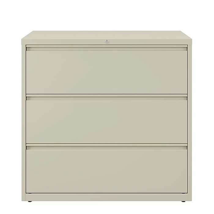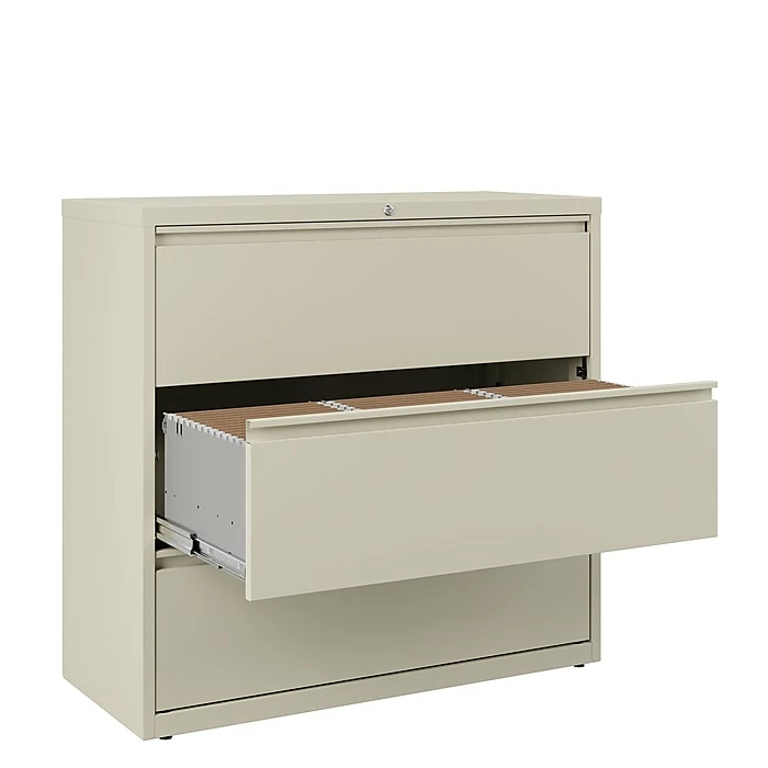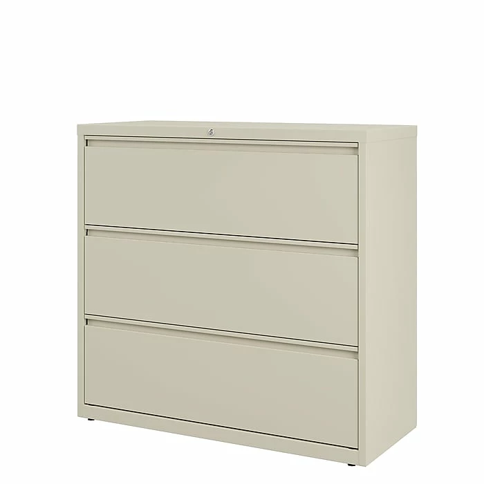 Store and organize business records and important documents with this commercial three-drawer lateral file cabinet. Boasting three large-capacity 42-inch-wide drawers, this cabinet offers ample space for storing letter, legal and A4-sized documents and lets you manage access to stored materials with a built-in lock. Three-piece ball-bearing slide suspensions ensure the drawers open and close smoothly, while a mechanical interlock system prevents more than one drawer from opening at a time for safe, tip-free operation. This commercial lateral file cabinet stands up to intense use with a durable steel construction.