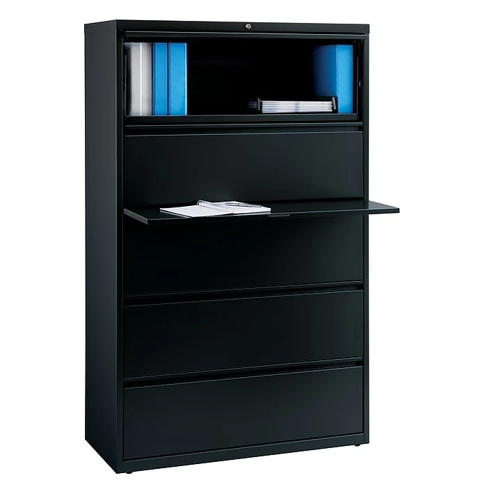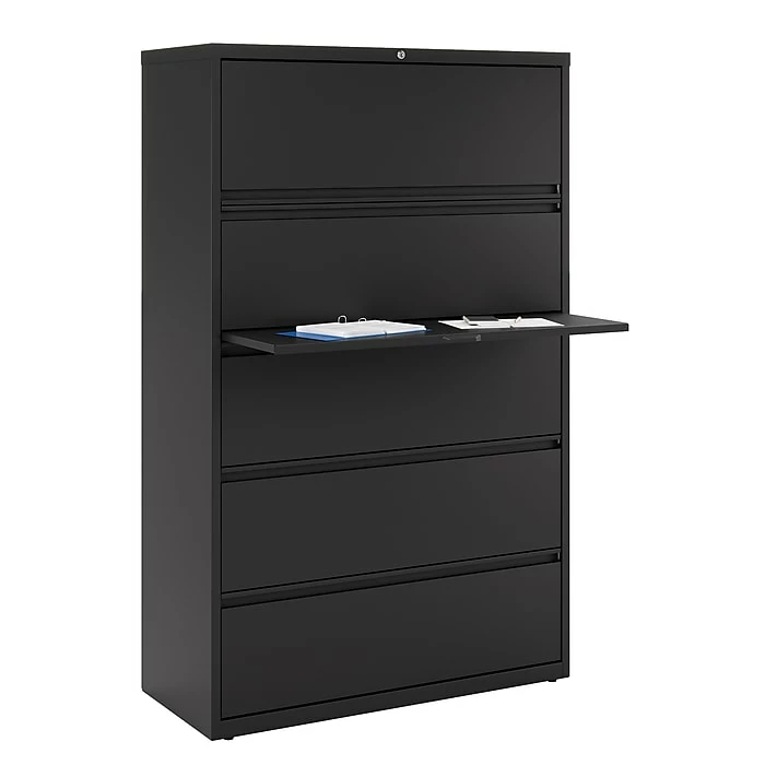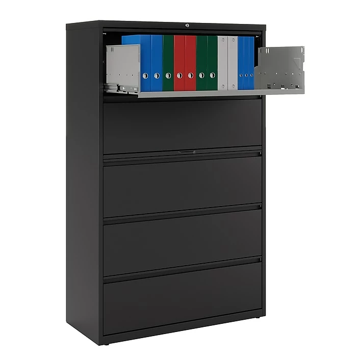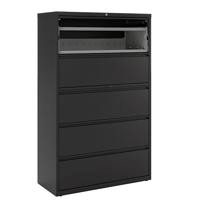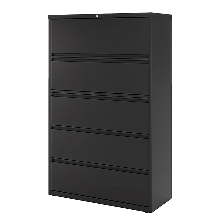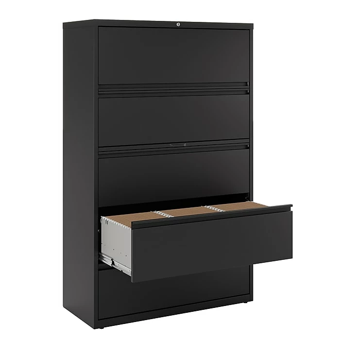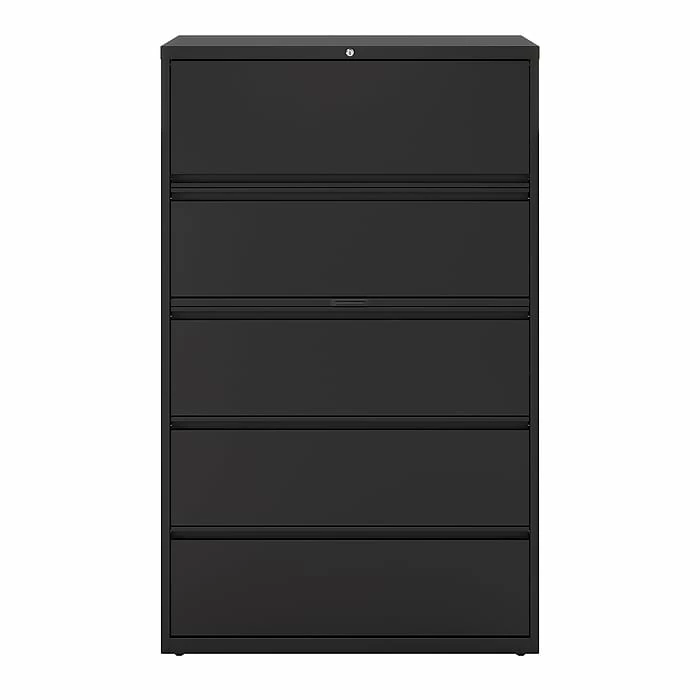 - Five-drawer lateral filing cabinet holds letter or legal size documents
